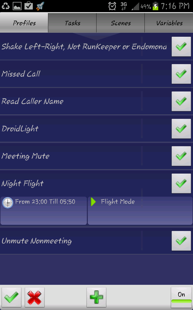 I have a Samsung Galaxy Note, but I presume you could do this on your Android or iPhone too (I don’t have an iPhone so I can’t confirm it!). On my phone, I installed an app called Tasker. Tasker allows you to write triggers for events and states and locations on your phone. Here are the some profiles I’ve written (and I’ve posted the recipes so you can do it to your phone too!)